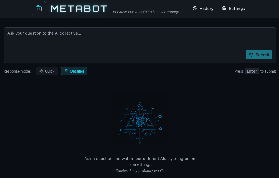 Having already found interesting variance between different models, including interesting and complementary holes in what they retrieved, I thought it would be interesting to more easily compare them per question. Why not make an app that can do that easily and repeatably? I also had a name I liked, which a quick search confirmed was not yet in either the iOS or Android app stores: Metabot.